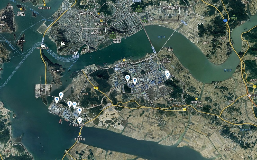 • 주요 시설: 남서쪽에 현대삼호중공업 조선소, 북서쪽에 구 목포공항