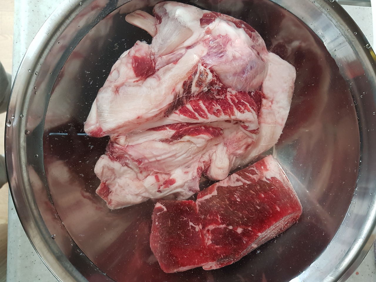 이 과정을 통해 잡내를 줄이고, 불순물을 제거합니다. - 큰 덩어리는 반으로 자르기