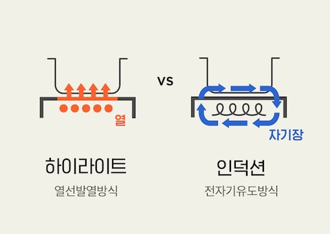 가장 큰 인덕션과 하이라이트 차이는 열을 발생시키는 방식입니다. 하이라이트는 상판 아래의 발열체가 직접 가열되어 상판을 뜨겁게 만든 후 용기를 데우는 방식입니다.