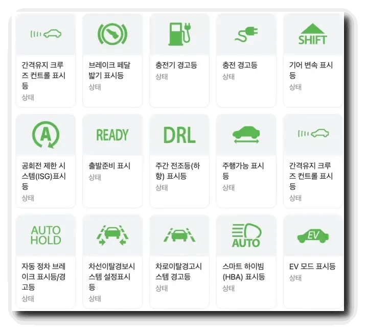 브레이크 패드가 닳아 교체가 필요하다는 의미입니다. 이 경고등을 무시하면 제동력이 급격히 저하되어 사고 위험이 커집니다. - 정속주행 켜짐(Cruise Control On)