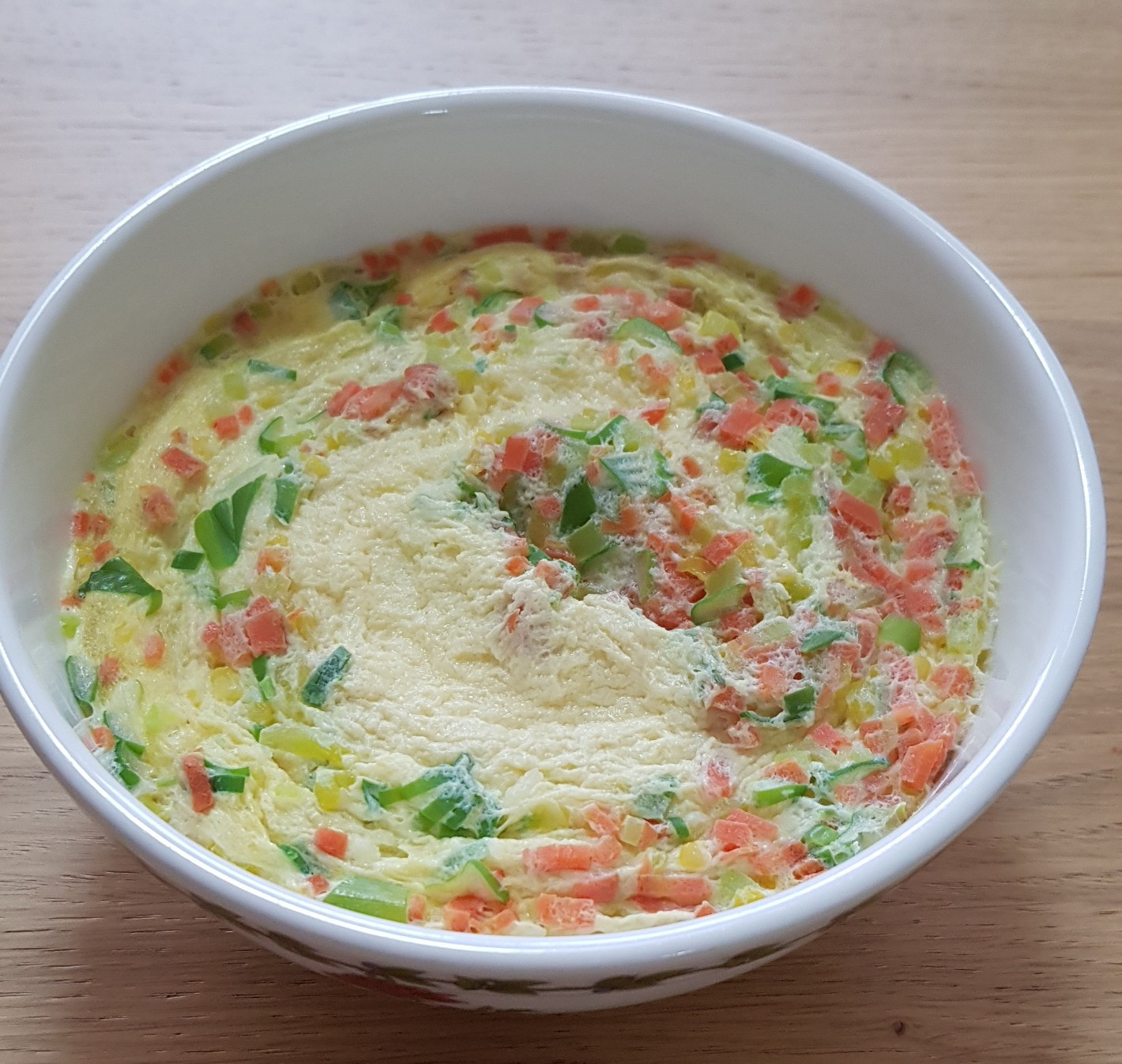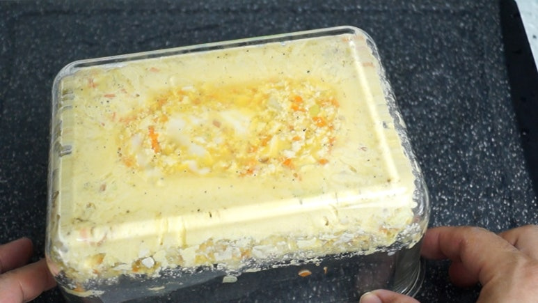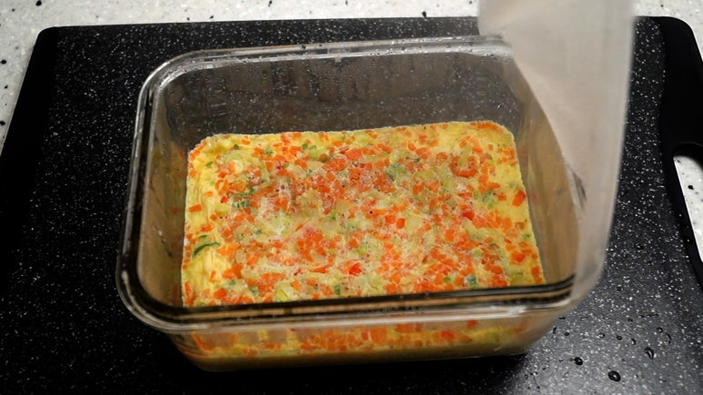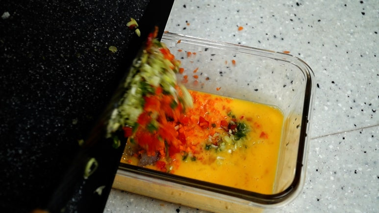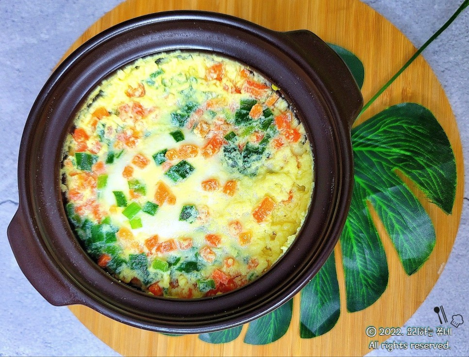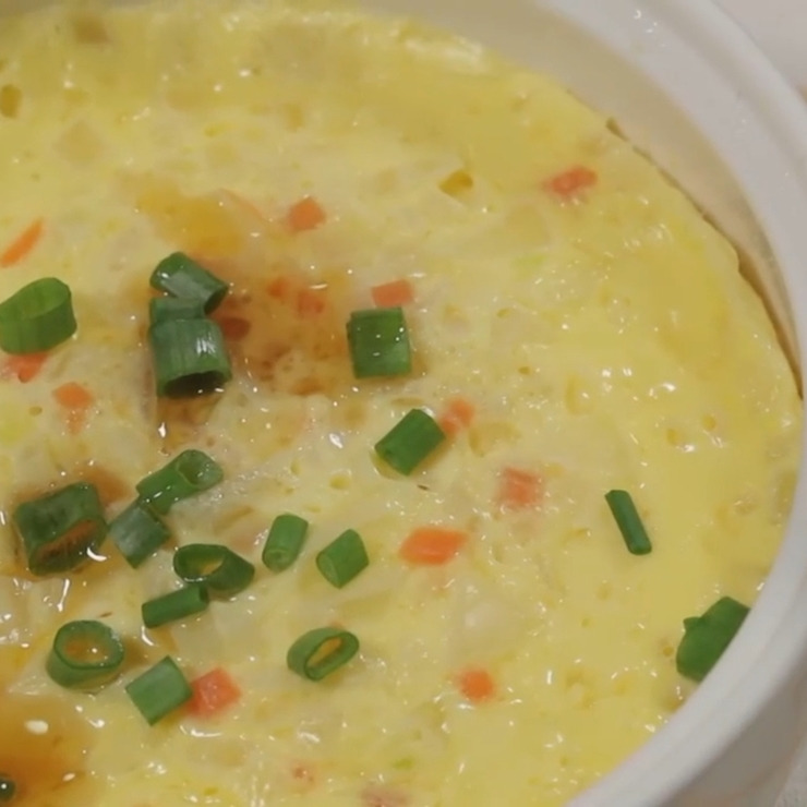 내열 용기에 잘게 썬 채소(당근, 파 등)를 먼저 깔거나 계란물과 섞어도 됩니다. 해산물(새우)은 미리 살짝 익혀 물기가 많지 않게 제거한 뒤 넣으세요.