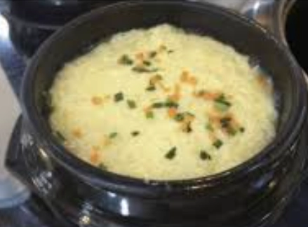 - 물 대신 다시마 육수와 소량의 미림, 간장으로 간을 맞추고 표고버섯, 새우, 은행(또는 옥수수)을 넣어 만듭니다. 부드러운 식감과 풍부한 향이 특징입니다.