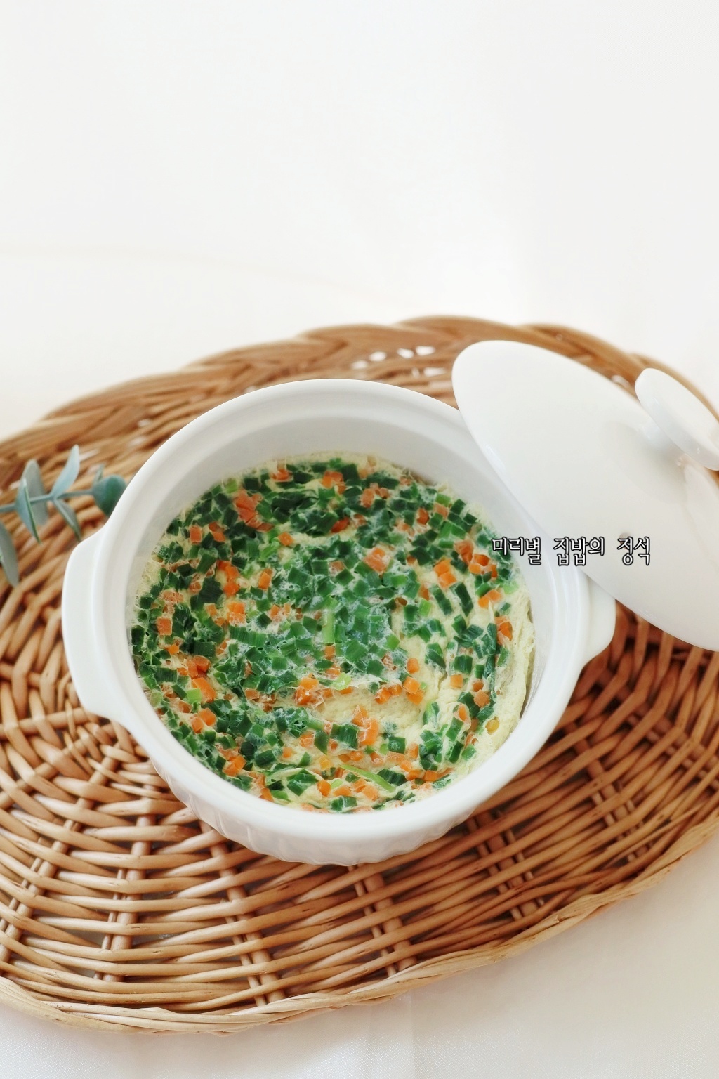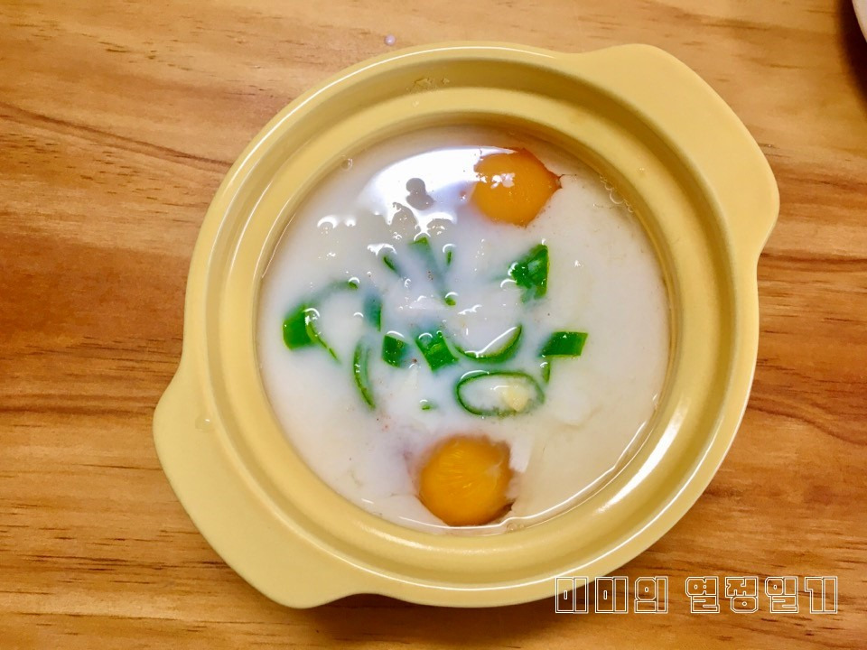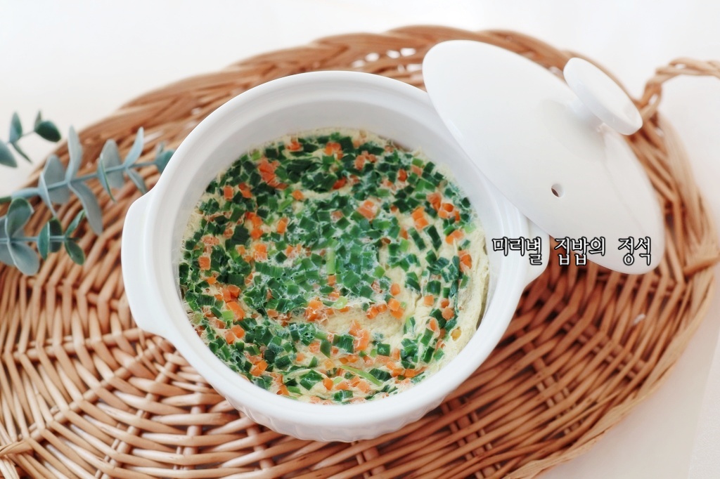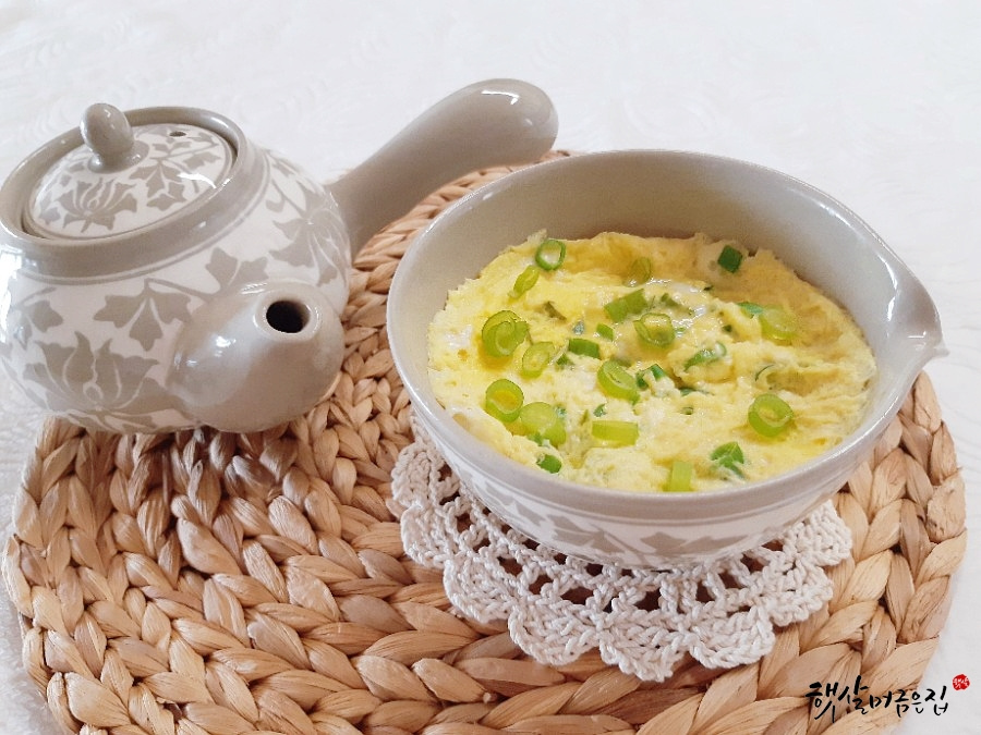 가열을 마친 후 1분 정도 뜸을 들이면 전체적으로 열이 고르게 퍼져 조직이 안정됩니다. 마지막으로 송송 썬 파와 참기름 한두 방울을 떨어뜨려 향을 더한 뒤 그대로 상에 내세요.