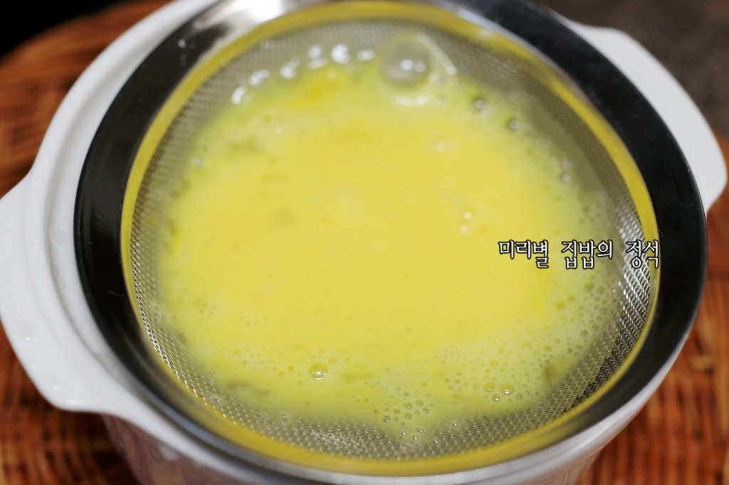풀어놓은 계란물을 체에 한 번 걸러 불순물과 기포, 알끈을 제거합니다. 이 과정을 통해 표면이 매끈하고 조직이 촘촘한 계란찜을 만들 수 있습니다.