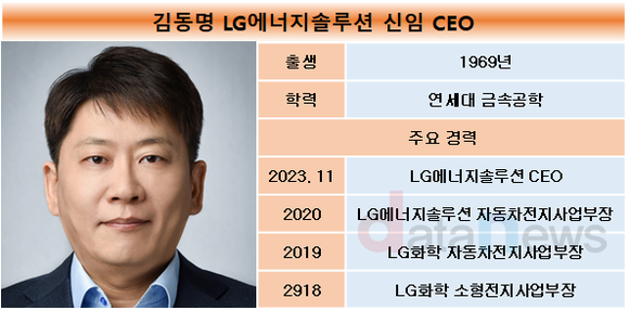 2024년, LG에너지솔루션은 새로운 CEO를 선임하였습니다. 새로운 CEO로는 김동명(金東明) 자동차전지사업부장(사장)이 임명되었습니다. 김동명 사장은 회사 내에서 지난 수십 년간 다양한 분야에서의 경험을 쌓아온 전문가로, 특히 배터리 사업 분야에서의 탁월한 리더십으로 알려져 있습니다.